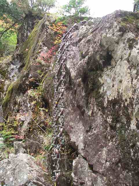 そしてここまでに無かった物が現れました。鎖ハシゴ(笑)これを登るのか!?しかも岩はハングしてるし(爆)