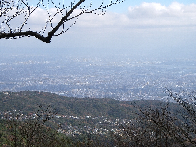 山頂の少し下辺りから見た景色はこちら。梅田のビル街が見える。