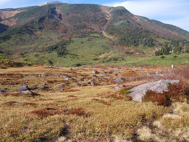 50mほど上り返し、日本庭園のような湿原らしい場所の木道を歩いてしばらく、南竜ヶ番場のバンガローが見えた。