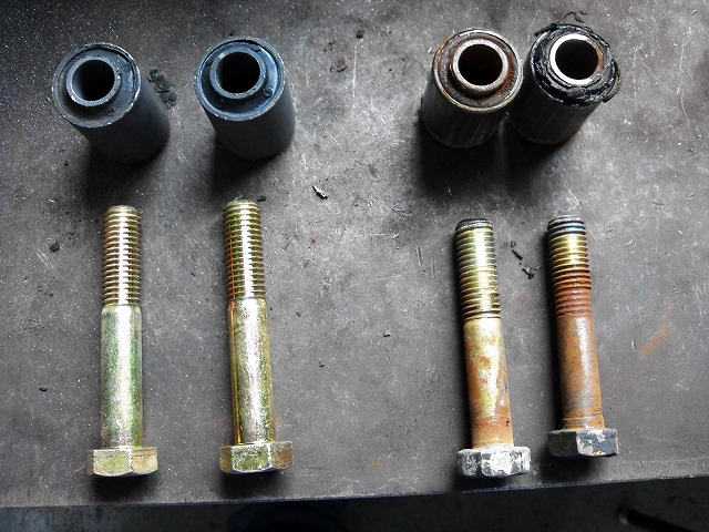 左が対策部品のボルトと新品ブッシュで右が磨耗したボルトと潰れたブッシュ