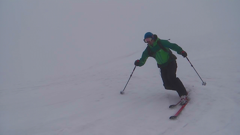 行動食補給程度で早々と滑降準備に取り掛かり、方向確認し11時13分滑降開始。