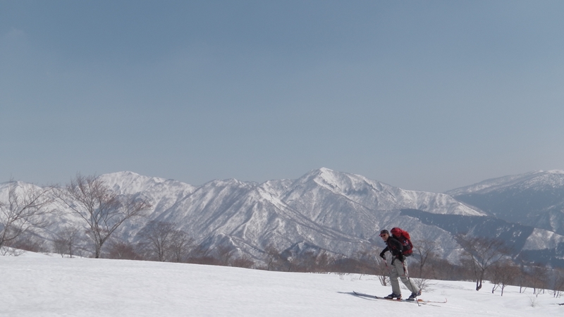 薙刀平末端まで稜線寄りに気持ちよく滑り、野伏を見上げて遅いランチとする。