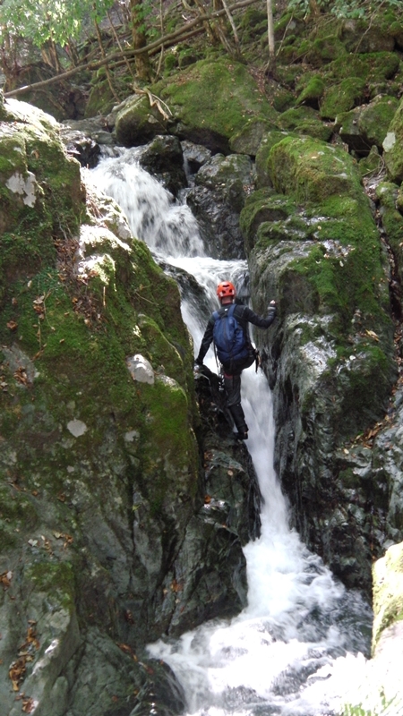 岩間の2mは滝裏に潜り込んでルートを模索する。