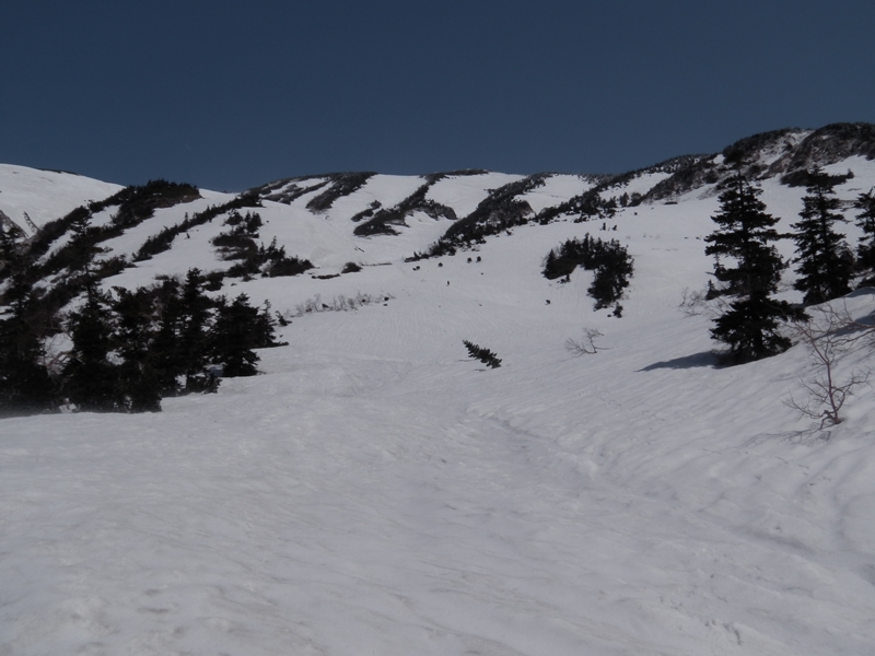 ここも同じくガリガリの固い斜面。時間を置いたら少しは滑りやすくなるのだろうけど、この斜面を見たら待ってられない!少しずつ慎重にターンを刻み高度を下げていくと徐々に滑りやすい雪面となった。快適快適♪テレマーク万歳!