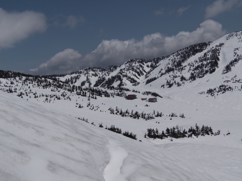 100mほどの標高差をシールを張ったまま本日初めての滑りで12時45分に今晩お世話になる南竜避難小屋へ。残念なことに夏用の扉が開いたままで、しかも内扉からトイレの扉まで全てが開いたままで内部まで雪が入り込み積もってる・・絶句。