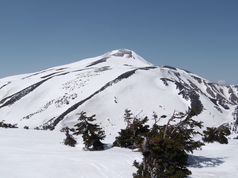 1900m付近のS字に差しかかったらセオリー通りシールを張って、白山釈迦岳に向かって登り返しの開始。強い日差しの下で汗をかくこと1時間と少々、11時11分に白山釈迦岳2053.2mに到着し大休止となった。