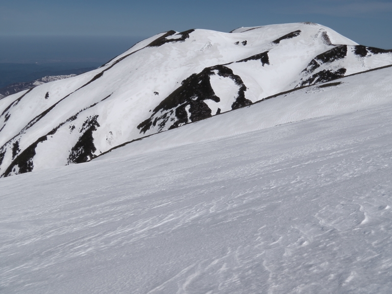 再び外に出て軽くなったザックを背負い、油阪の頭を目指す・・つもりだったけど、直ぐそばに見える2244.0mピークのほうが近くて、しかもメローな斜面が気もち良さげぢゃない?と意見は一致し登りにかかる。