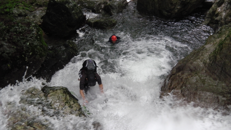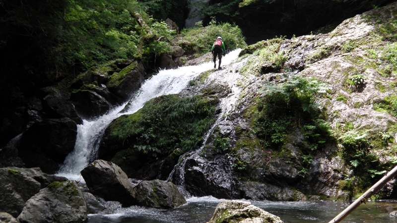 しばらく淵を泳いだり小滝を登ったりと穏やかな流れの中を楽しく進むと、じきに巨岩が重なりはじめ傾斜が増して2~3mの滝が次々と出てきた。