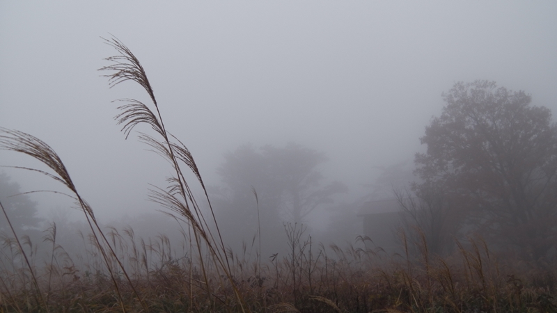 急登をスローペースで進み8時55分船上山避難小屋に。雨は小降りになるものの濃いガスの中で数十m程しか視界は無い。