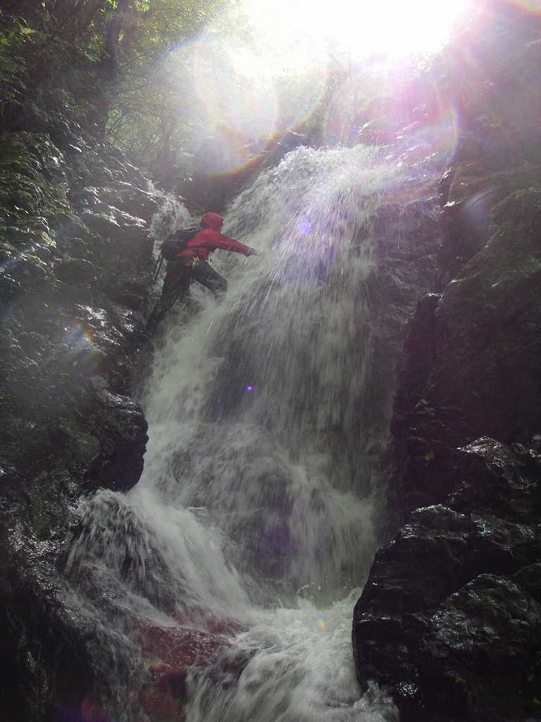 5~6mの直登出来る滝が次々と出て来、雨具を着込んだ私もシャワーで果敢に攻めます。