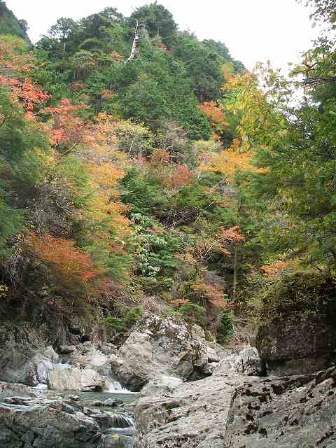 土曜夜24時半、熊渡の駐車スペースに車を止め小宴のあと2時頃就寝。6時起床で外に出るとまずまずの空模様。早速準備と朝食を済ませて6時50分に林道の車止めをくぐり、約40分の林道歩きで弥山川に下り立ちました。